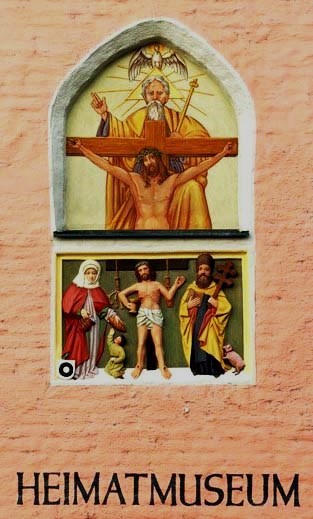 Stadtplatzseitig befindet sich neben dem Stadtturm am Spitalgebäude, dem heutigen Vilsbiburger Heimatmuseum, in einem Sitzbogen ein Dreifaltigkeitsfresko; darunter ein in Stein gemeißelten Zeichen der Barmherzigkeit – ein Zeugnis des Glaubens.