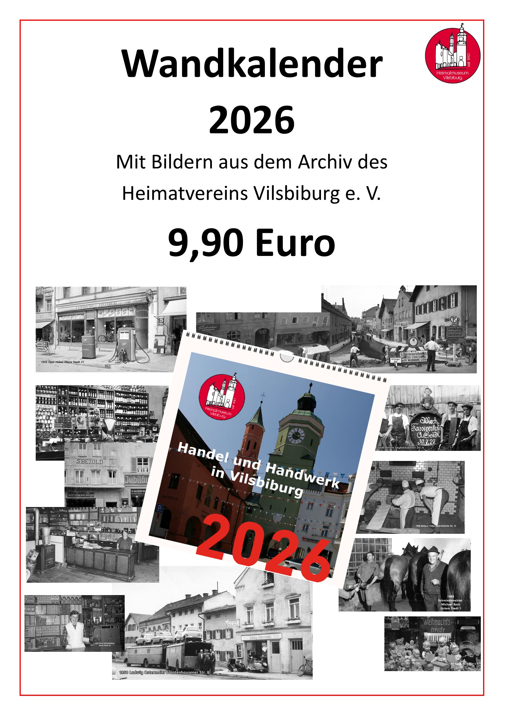 Das perfekte kleine Weihnachtsgeschenk: Pünktlich zur langen Kultur- und Einkaufsnacht in Vilsbiburg beginnt der Heimatverein mit dem Verkauf seines Wandkalenders 2026. Unter dem Titel „Handel und Handwerk“ hat der Heimatverein zwölf wundervolle Bilder aus dem Stadtbild zusammengestellt und einen Wandkalender gestaltet. Der Verkauf startet am 7. November 2025 und läuft bis zum Jahresende während der üblichen Öffnungszeiten des Museums.