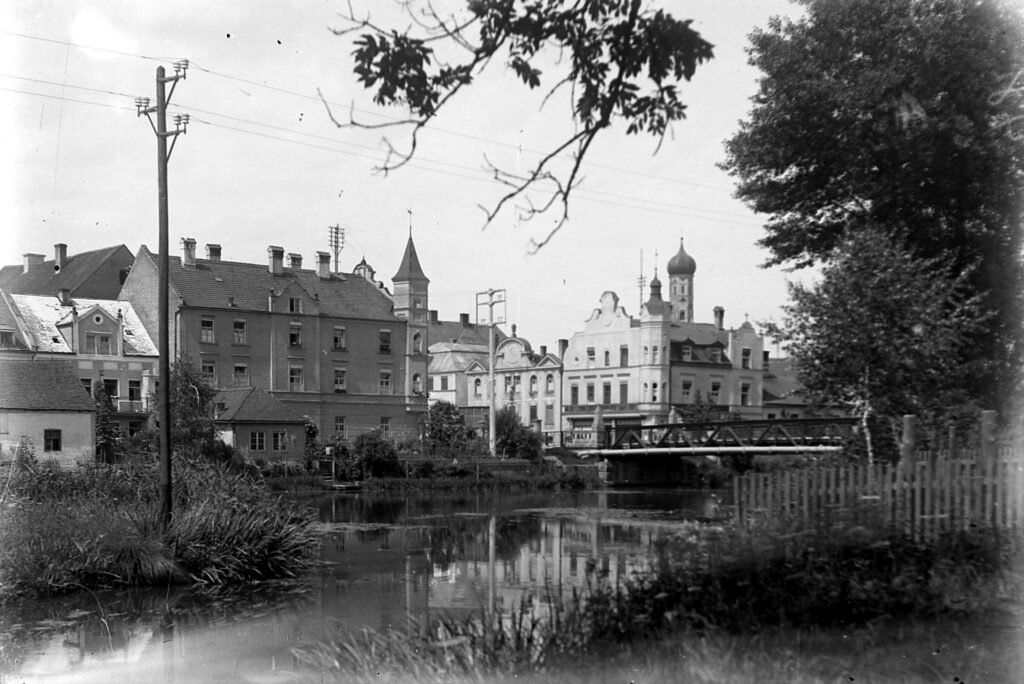 In den Anfangsjahren der Stromversorgung durchzogen viele Freileitungen die Marktgemeinde. Im Vordergrund verläuft eine Leitung vom Schalthaus in Richtung Achldorf, vor dem Rathaus eine Mittelspannungsleitung vom Pfarrbrückenweg zum Färberanger. Auf dem Dach des Rathauses ist noch die Niederspannungsleitung zur Haushaltsversorgung zu sehen. Foto: Archiv Heimatmuseum