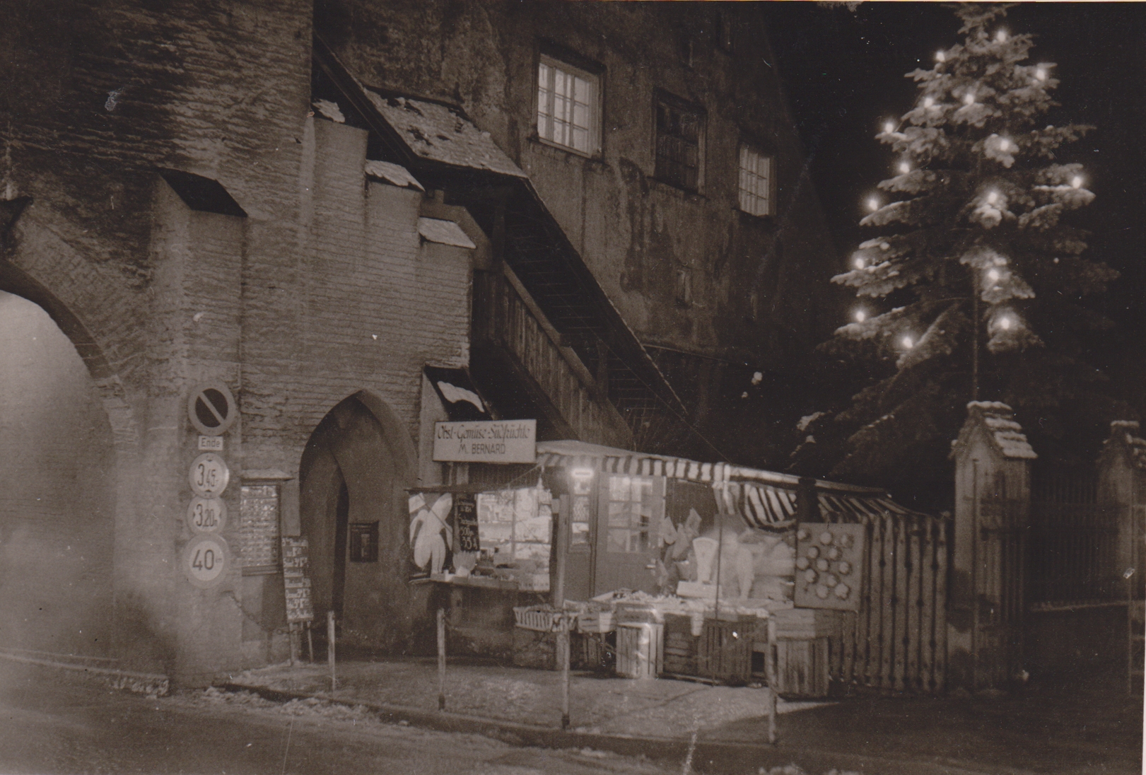 Das Nötigste für den Festtagstisch besorgten sich die Leute nicht auf der „grünen Wiese“ weit vor den Toren der Stadt, sondern in den kleinen Läden rund im Stadtzentrum, bei Martin Schmeisser, oder in den Geschäften von Knaus, Thalhammer oder Stein. Für Obst, Gemüse und Südfrüchte, also auch die begehrten Navelorangen, gab es einen speziellen Anbieter direkt am Stadttor. Es waren Martha und Paul Bernard, die sich hier nach ihrer Vertreibung aus Schlesien mit eher provisorischen Mitteln eine neue Existenz aufgebaut hatten. Der Gemüsestand, den es noch bis weit in die 1950er Jahre gab, ehe die Bernards in der Oberen Stadt einen richtigen Laden bezogen, versperrte zwar den Blick in den idyllischen Spitalgarten, dafür genoss man schon beim Vorbeigehen den verführerischen Duft der begehrten Köstlichkeiten und seine Illumination erzeugte zusammen mit dem Lichterbaum und den wenigen Zentimetern Neuschnee die typische Weihnachtsstimmung.